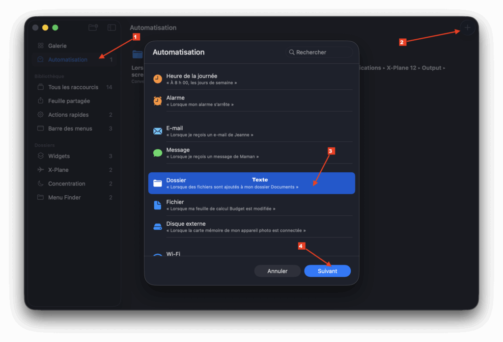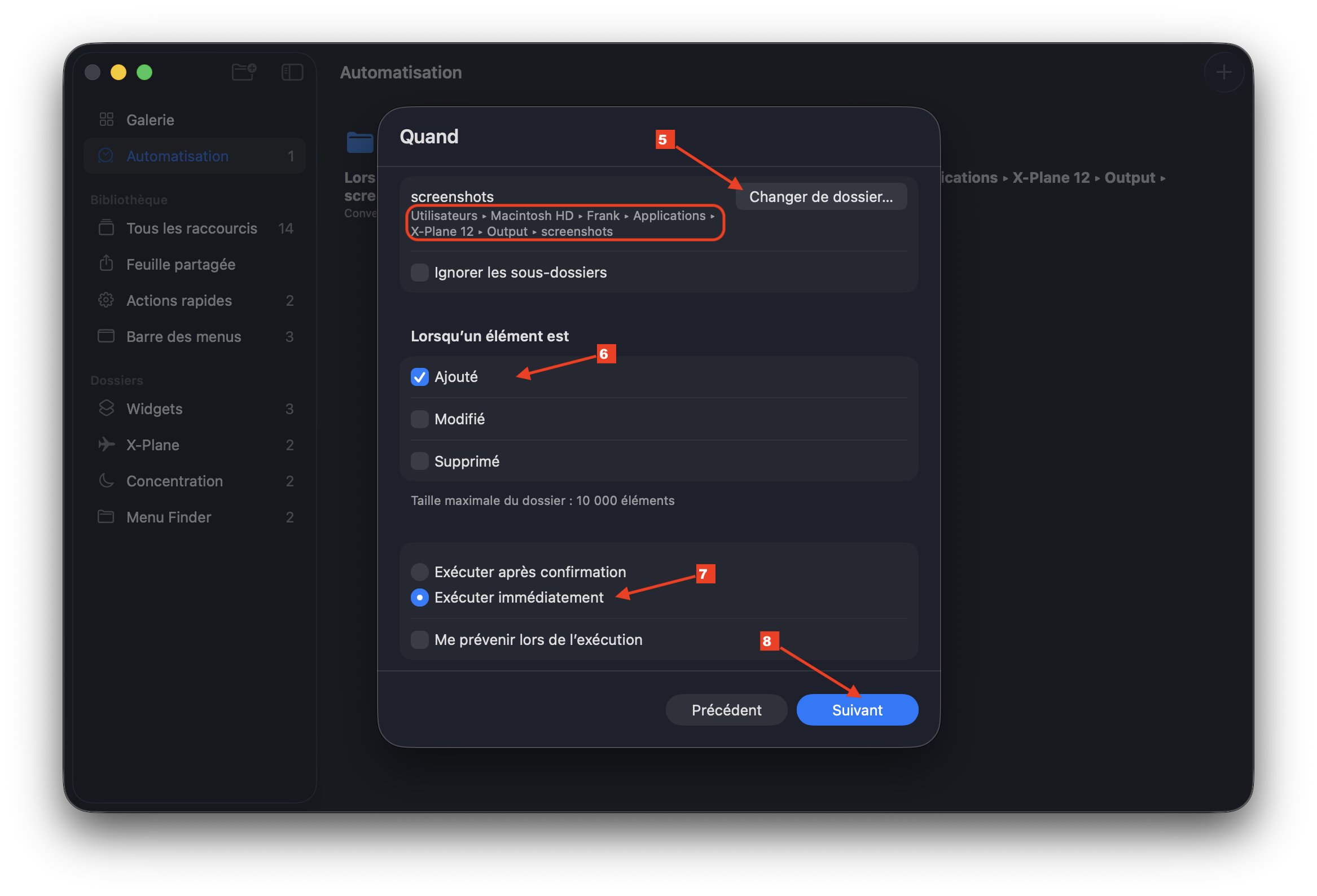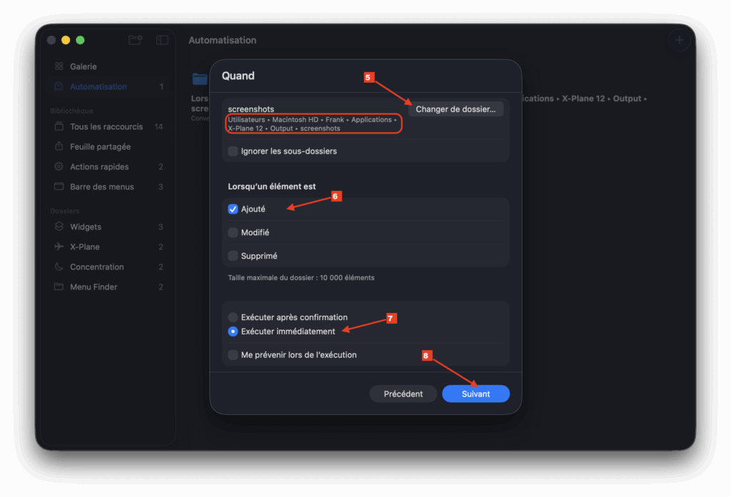 Une fois le dossier screenshots défini, cocher Ajouté(6) comme événement déclencheur du script de Raccourcis.
