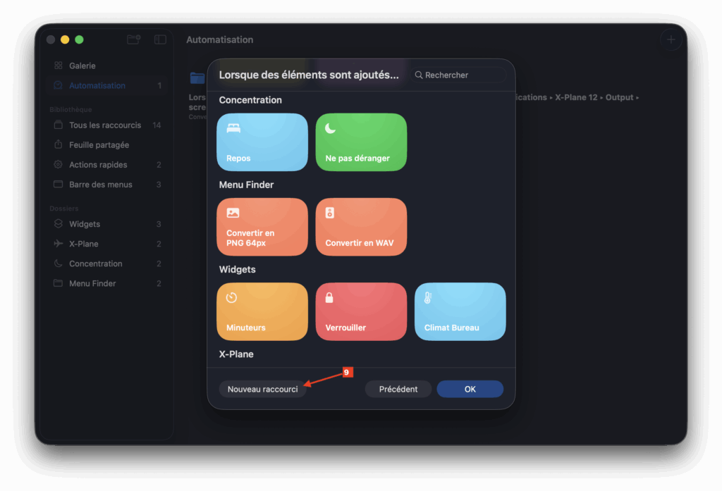 L’éditeur visuel du raccourci est maintenant accessible. Ce raccourci se lancera automatiquement en arrière-plan à chaque fois qu’un fichier sera déposé dans le dossier « screenshots » d’X-Plane.
