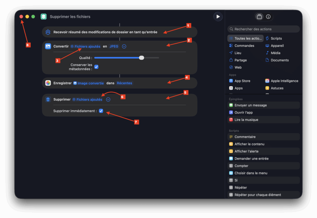 Ajouter l’action « Supprimer les fichiers »(5). Cette action supprime la capture d’écran originale.
