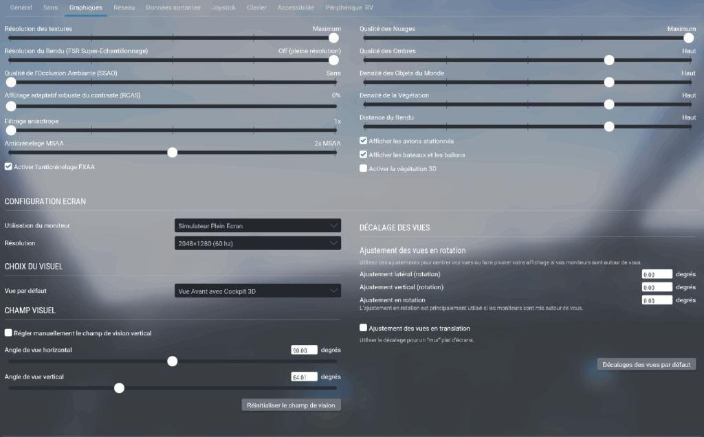 Qualité des ombresHautHaut pour de belles ombres, moyens sinon, voir Avion uniquement pour un boost sérieux de FPS (mais pas d’ombre dans le monde qui nous entourant et des ombres médiocres pour l’avion)