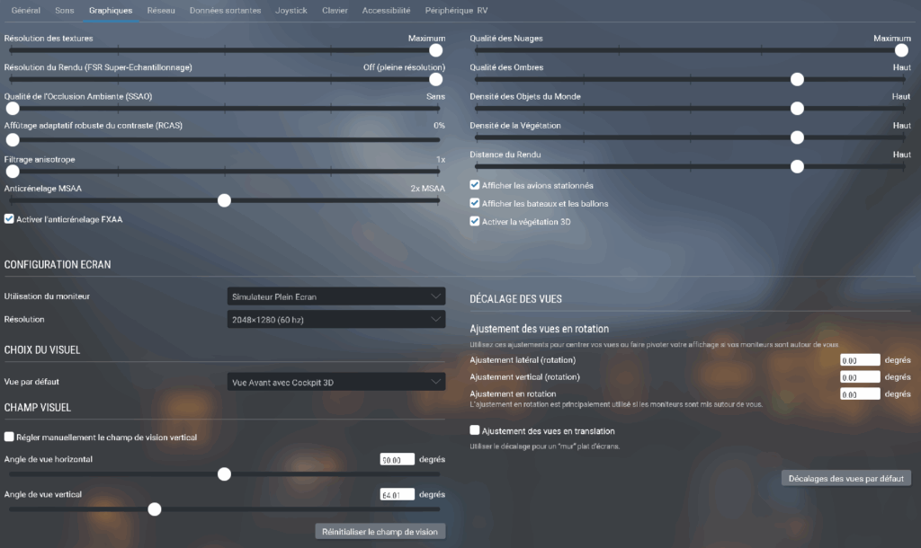 | Qualité des ombres | Haut | Maximum | Haut pour de belles ombres, moyens sinon, voir Avion uniquement pour un boost sérieux de FPS (mais pas d’ombre dans le monde qui nous entourant et des ombres médiocres pour l’avion) |